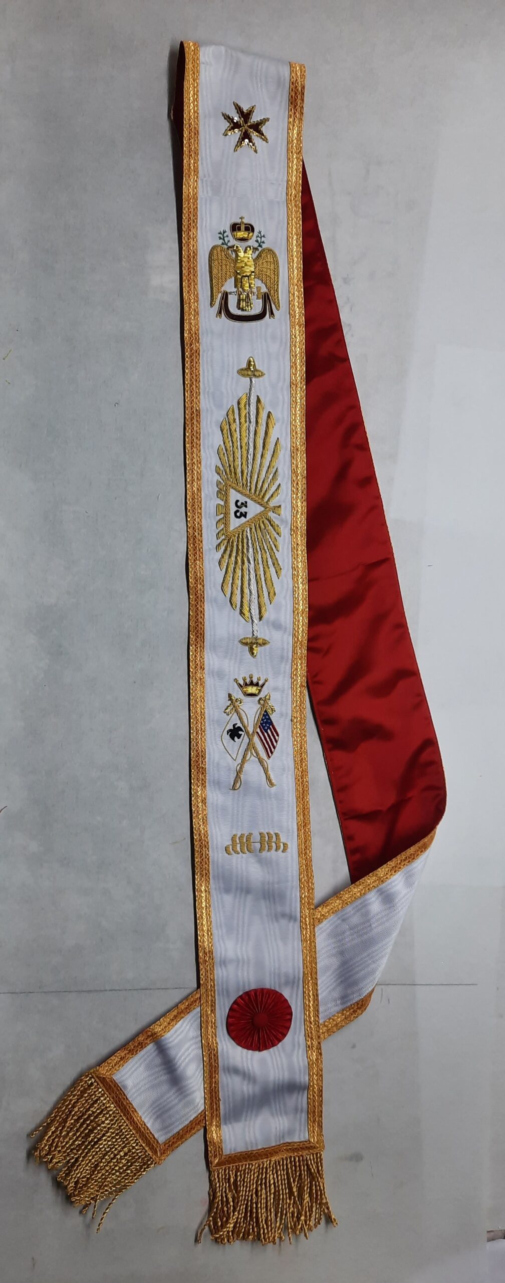 Enhance your Masonic regalia collection with this premium Scottish Rite 33rd Degree Sash. Crafted with high-quality white moiré ribbon with red satin backing, this elegant sash features hand embroidery with gold bullion wire and thread, trim with gold braid. Red rosette on the edge of the embroidery. Gold silk thread fringes on the bottom of the edges, and iconic Scottish Rite symbols, signifying the highest honorary degree. Perfect for ceremonies, meetings, and collectors.