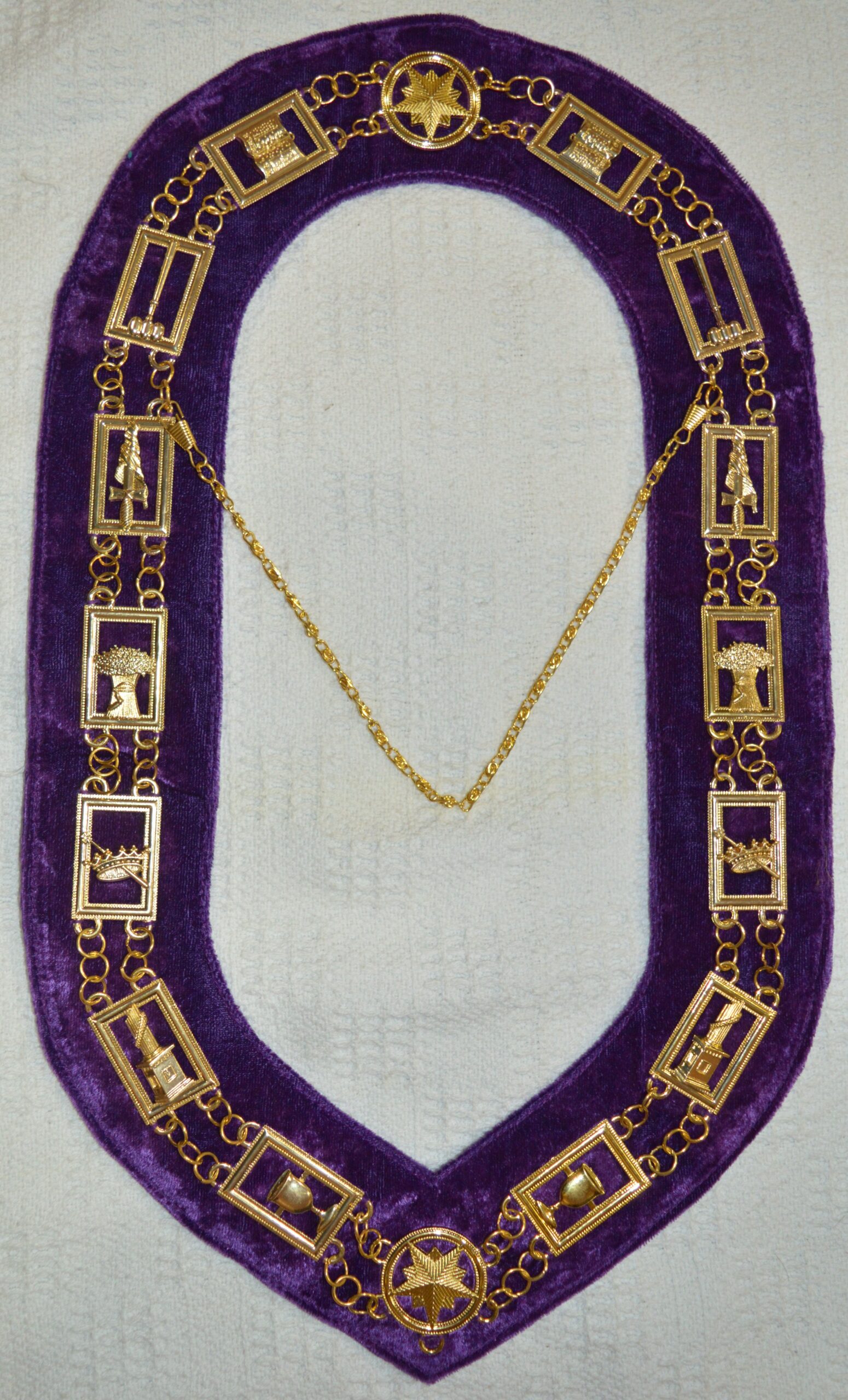 Enhance your Masonic regalia collection with this OES Chain Collar, a symbol of prestige and tradition. Crafted with high-quality golden metal links and purple velvet backing, this collar exudes elegance and authority. Perfect for OES officers, it offers a comfortable fit and a distinguished look for ceremonial occasions.